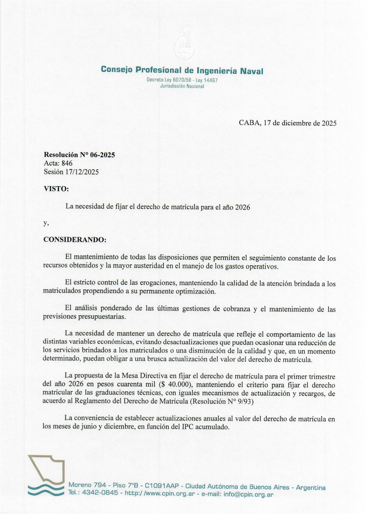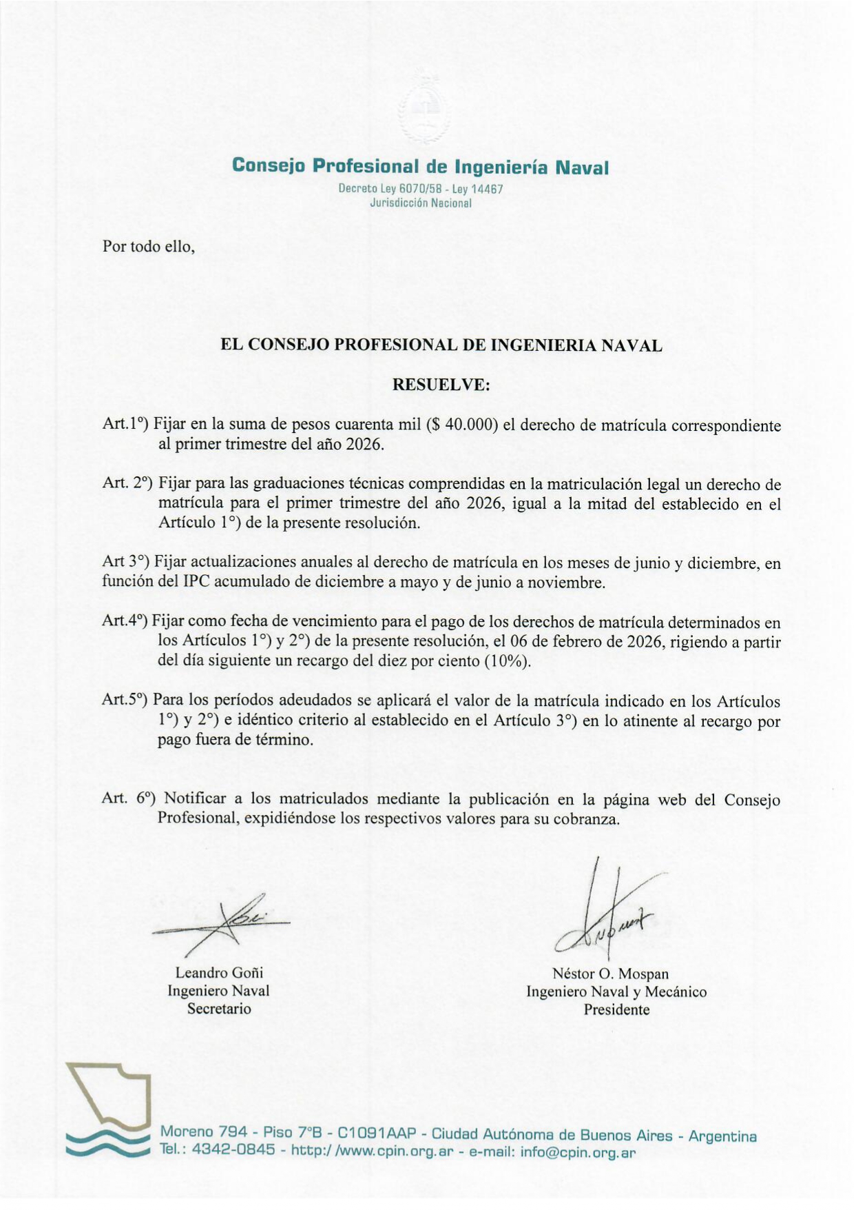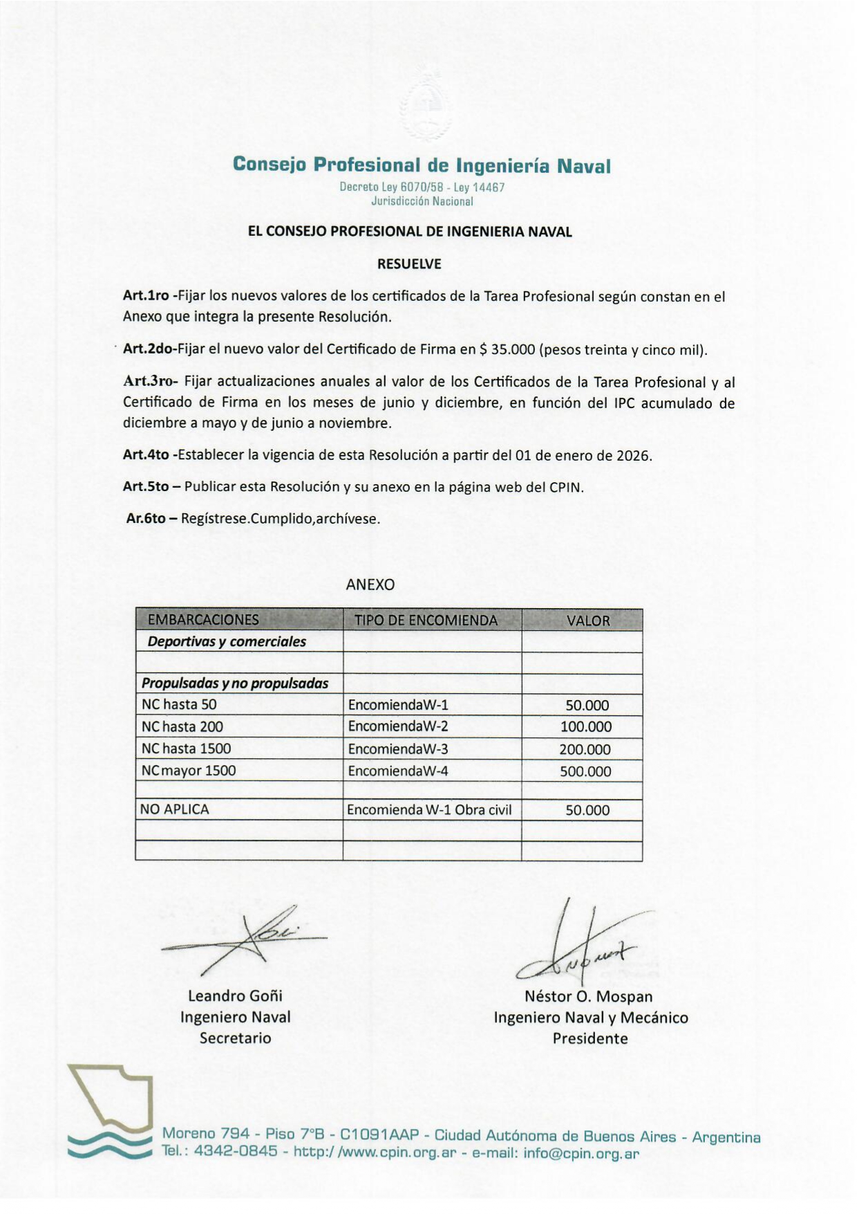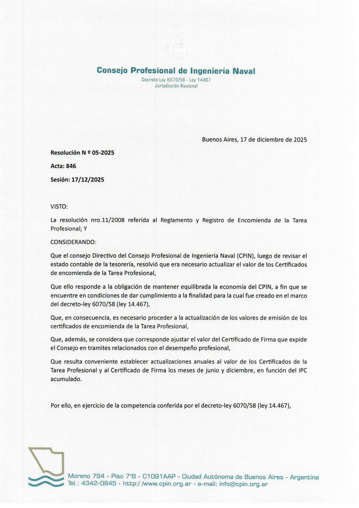 Por medio de la presente, se les informa que a partir del próximo año se aplicarán aumentos en los valores vigentes de matrículas, encomiendas de tarea profesional y certificados de firma.