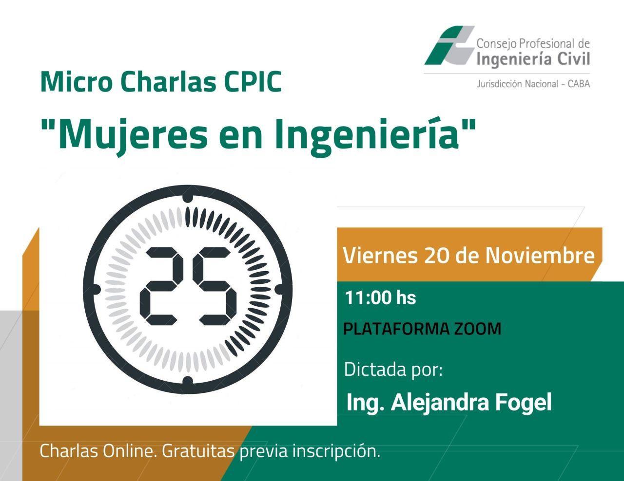 Compartimos con ustedes la charla dictada por la Ing. Alejandra Fogel «Mujeres en Ingeniería». La misma se llevara a cabo el viernes 20 de noviembre a las 11hs a través de la plataforma Zoom.